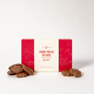 Each year, we ship fresh Pearson Farm pecan halves to a small chocolatier in Pennsylvania who creates our pecan chocolate products. Please note that this facility uses equipment that also processes peanuts, tree nuts, milk, eggs and wheat.